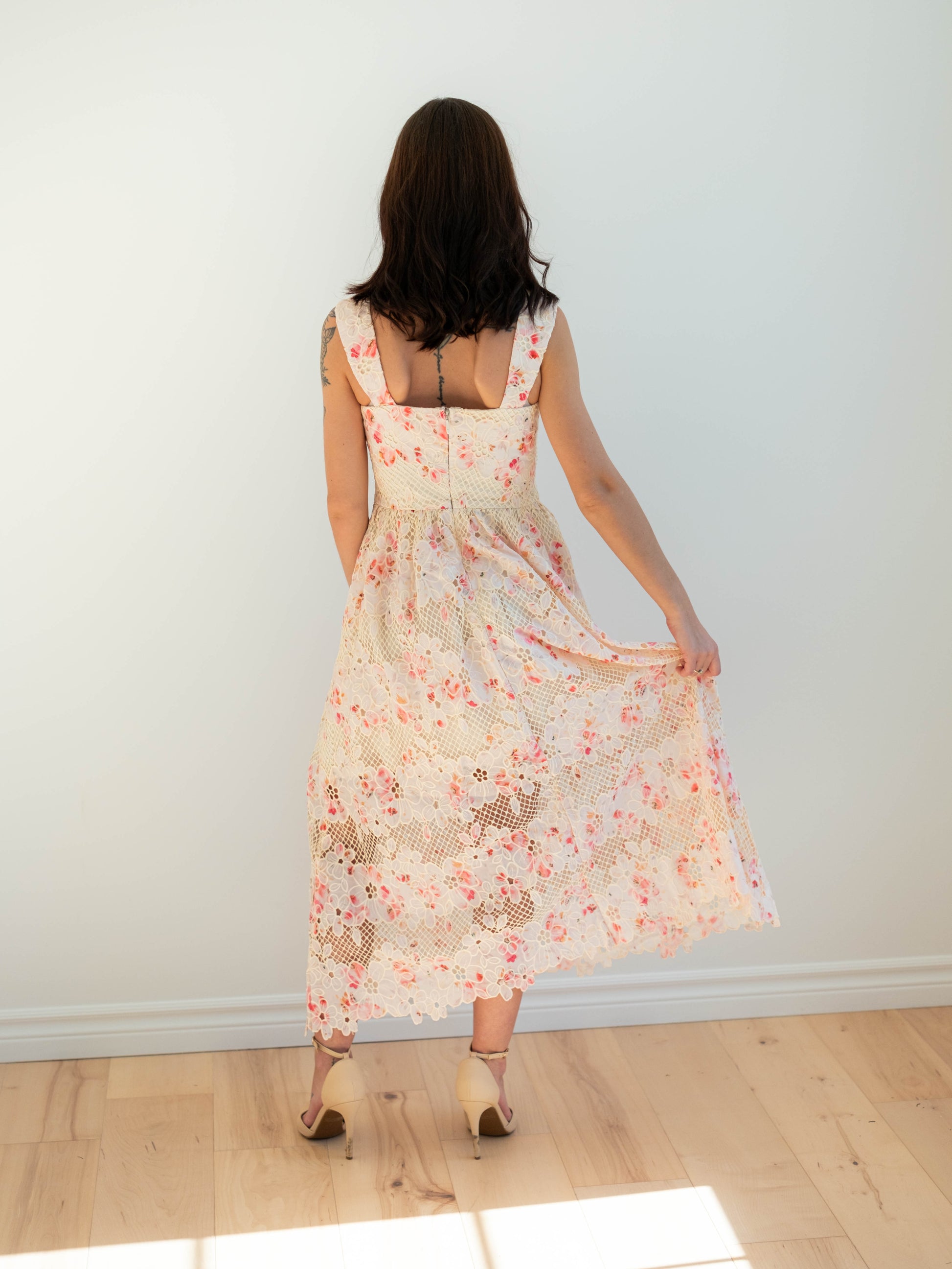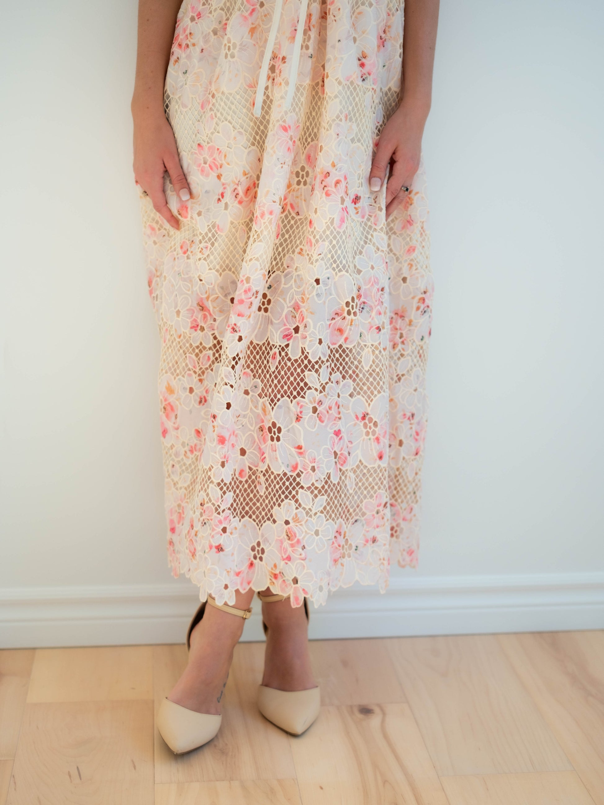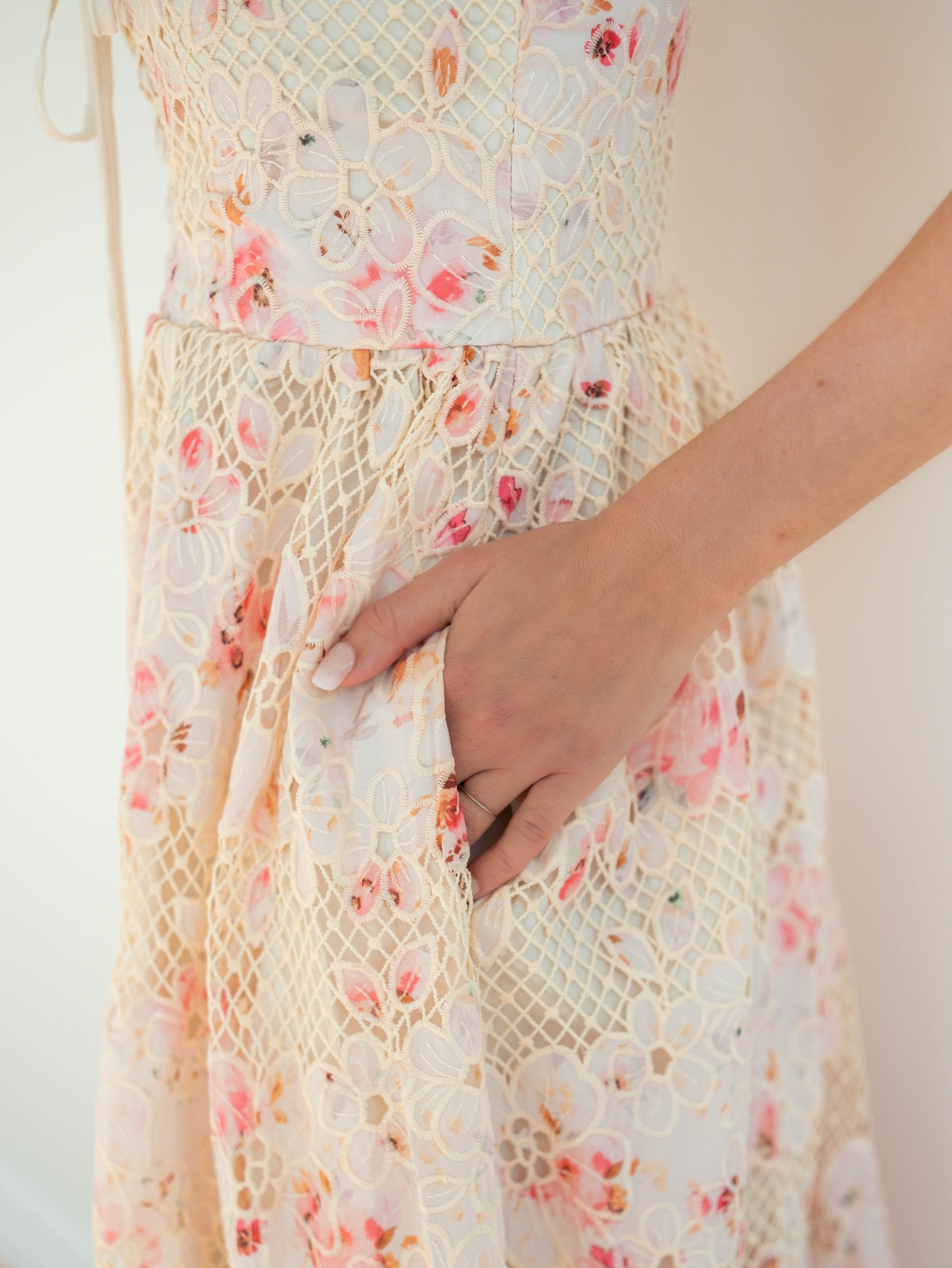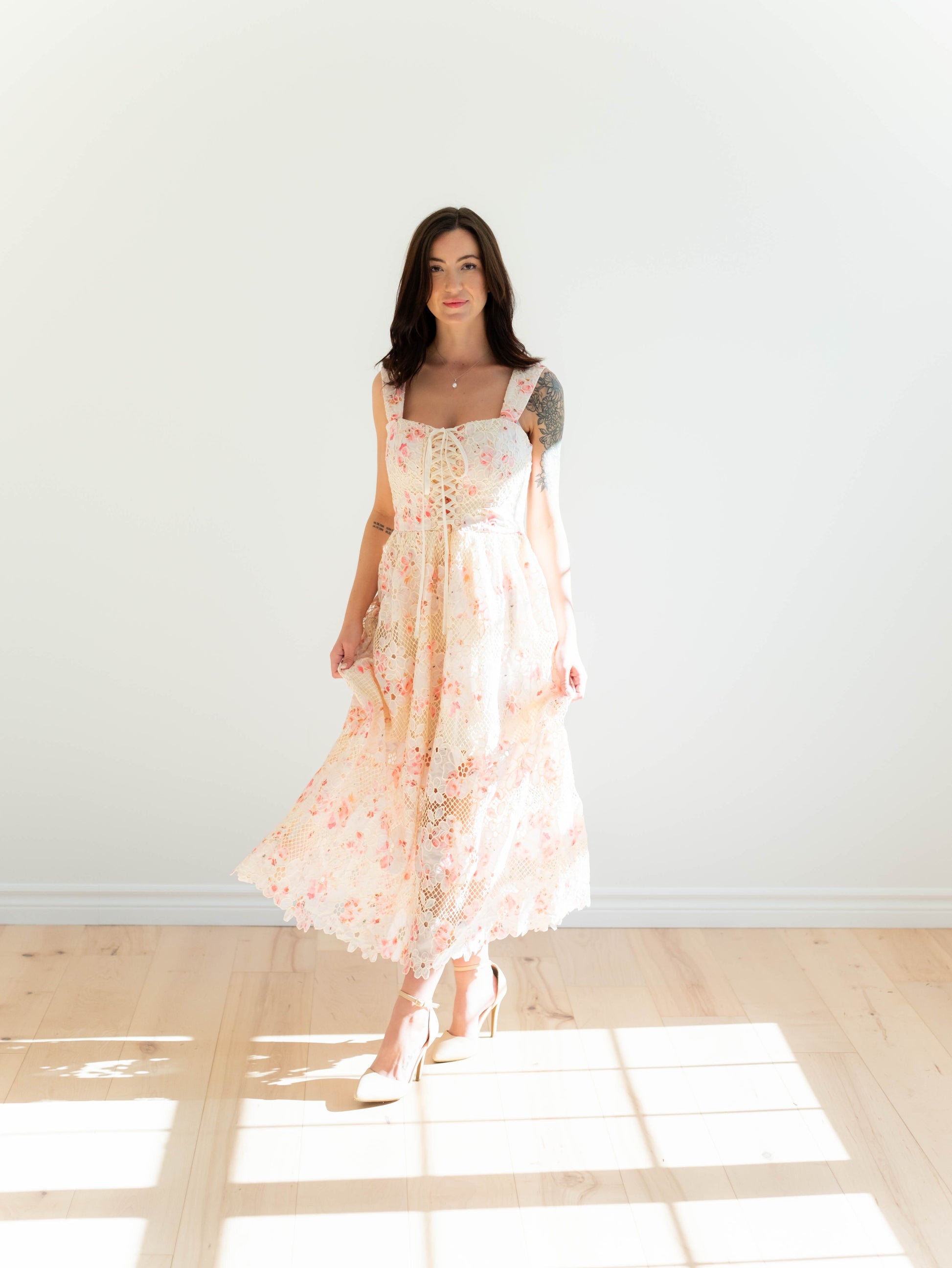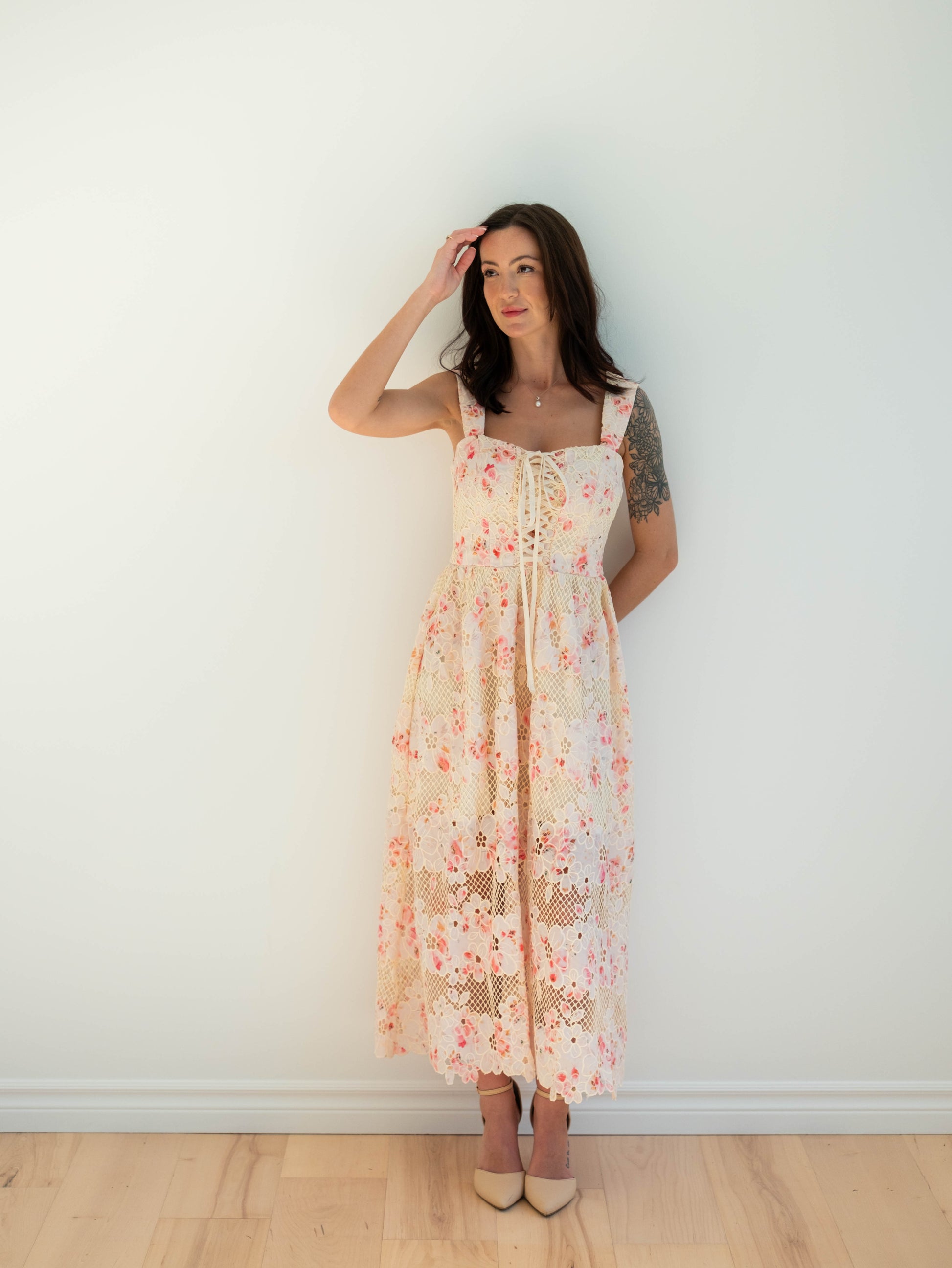 Be the belle of the ball in our Eloise Midi Dress. This stunning dress features a delicate floral lace pattern and a decorative lace up corset front with a charming edge lace along the hem. Plus, it has pockets for added convenience.