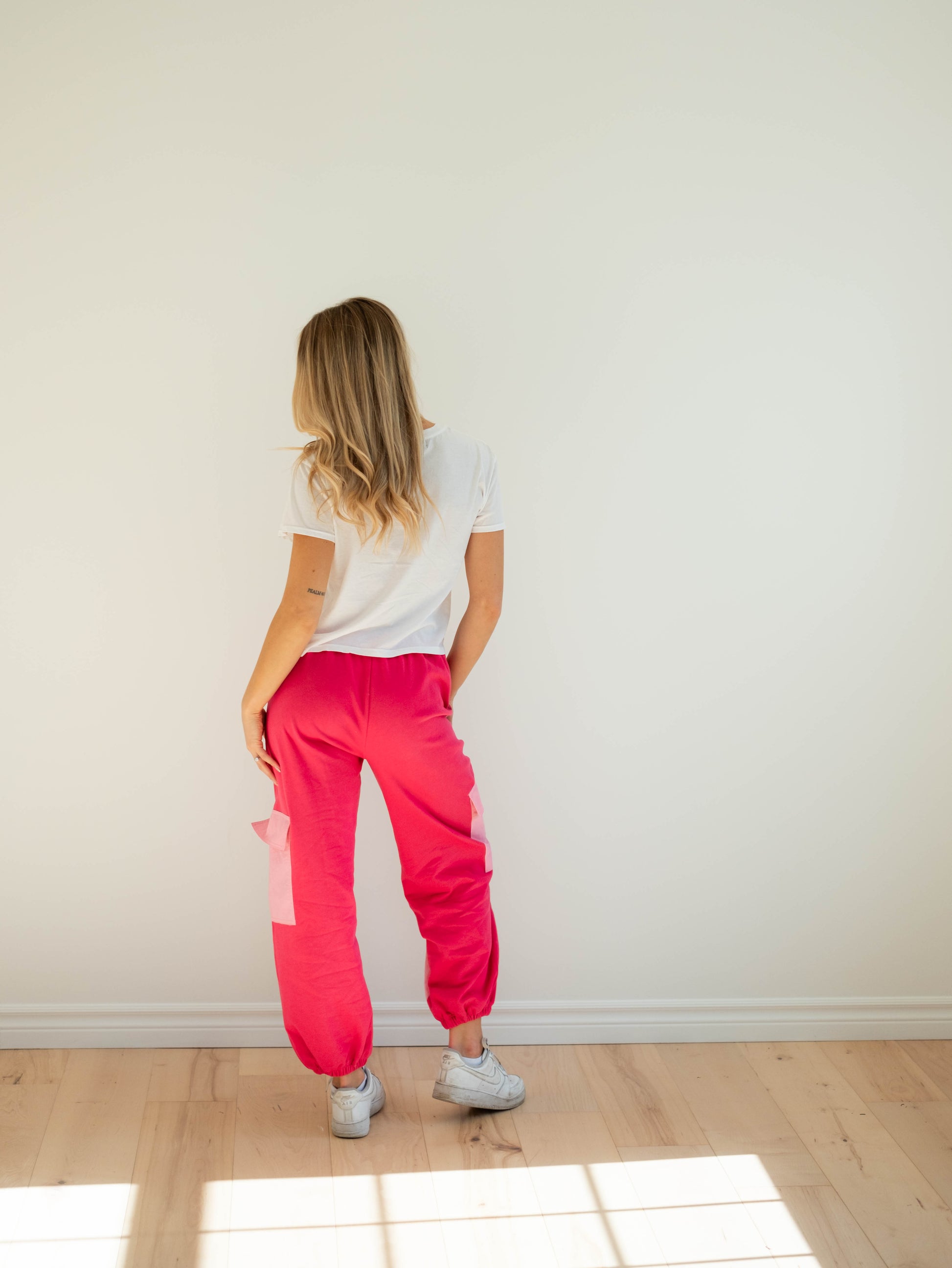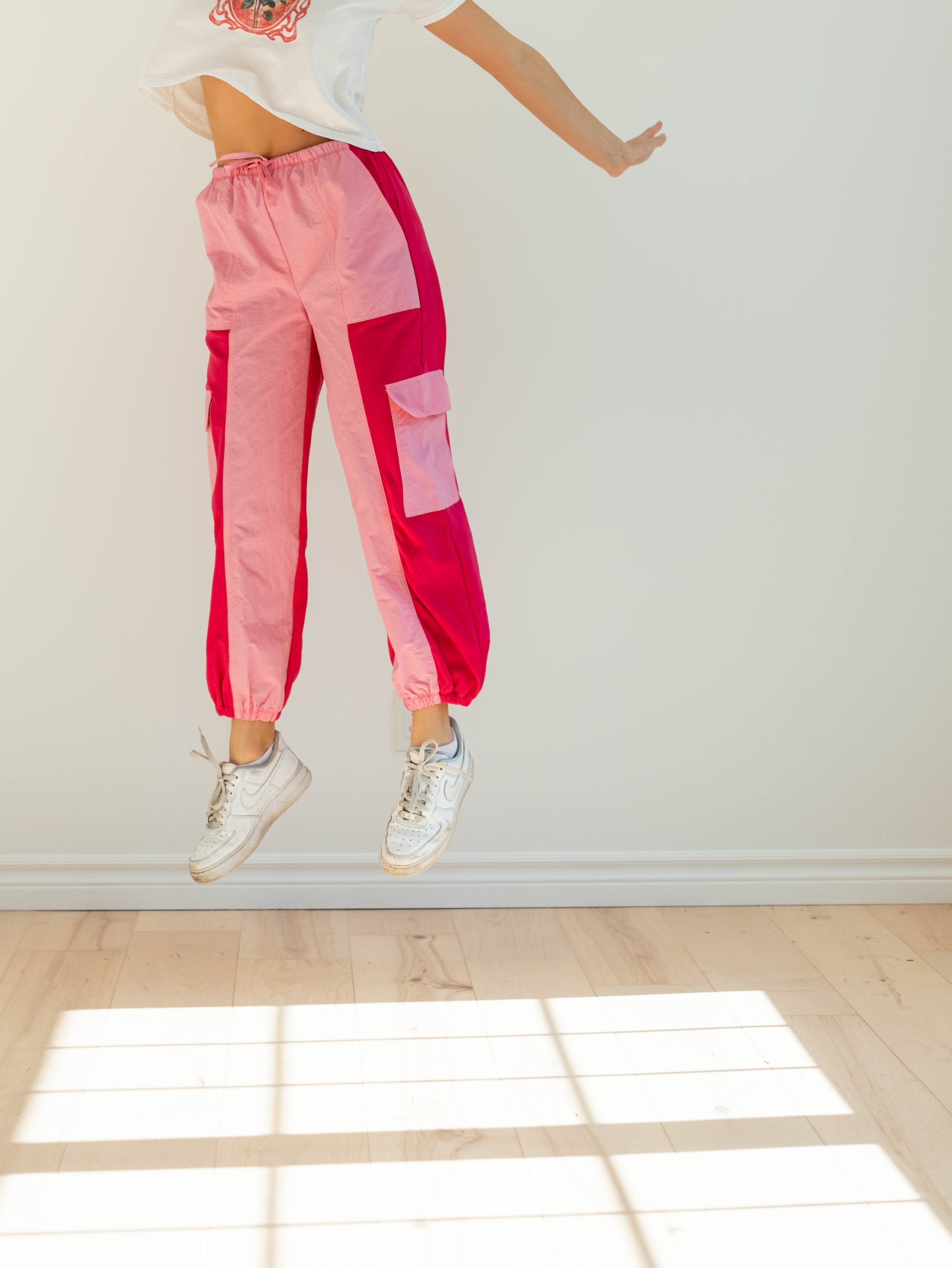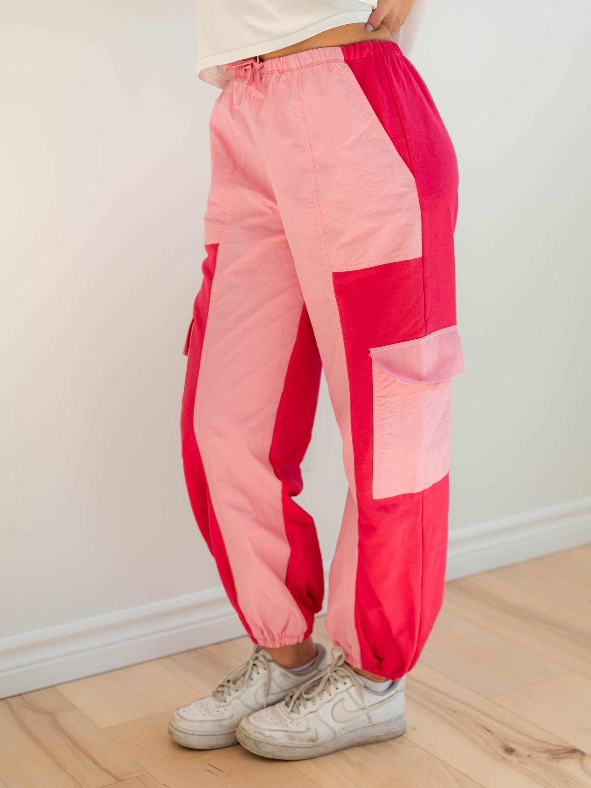 Stand out from the crowd with our Poppy Colour Block Joggers. Made from a cotton blend knit fabric, these cargo joggers are both trendy and comfortable. Featuring a drawstring waistband and pockets, the eye-catching colour block patchwork adds a one-of-a-kind touch. Say goodbye to boring joggers and hello to style.