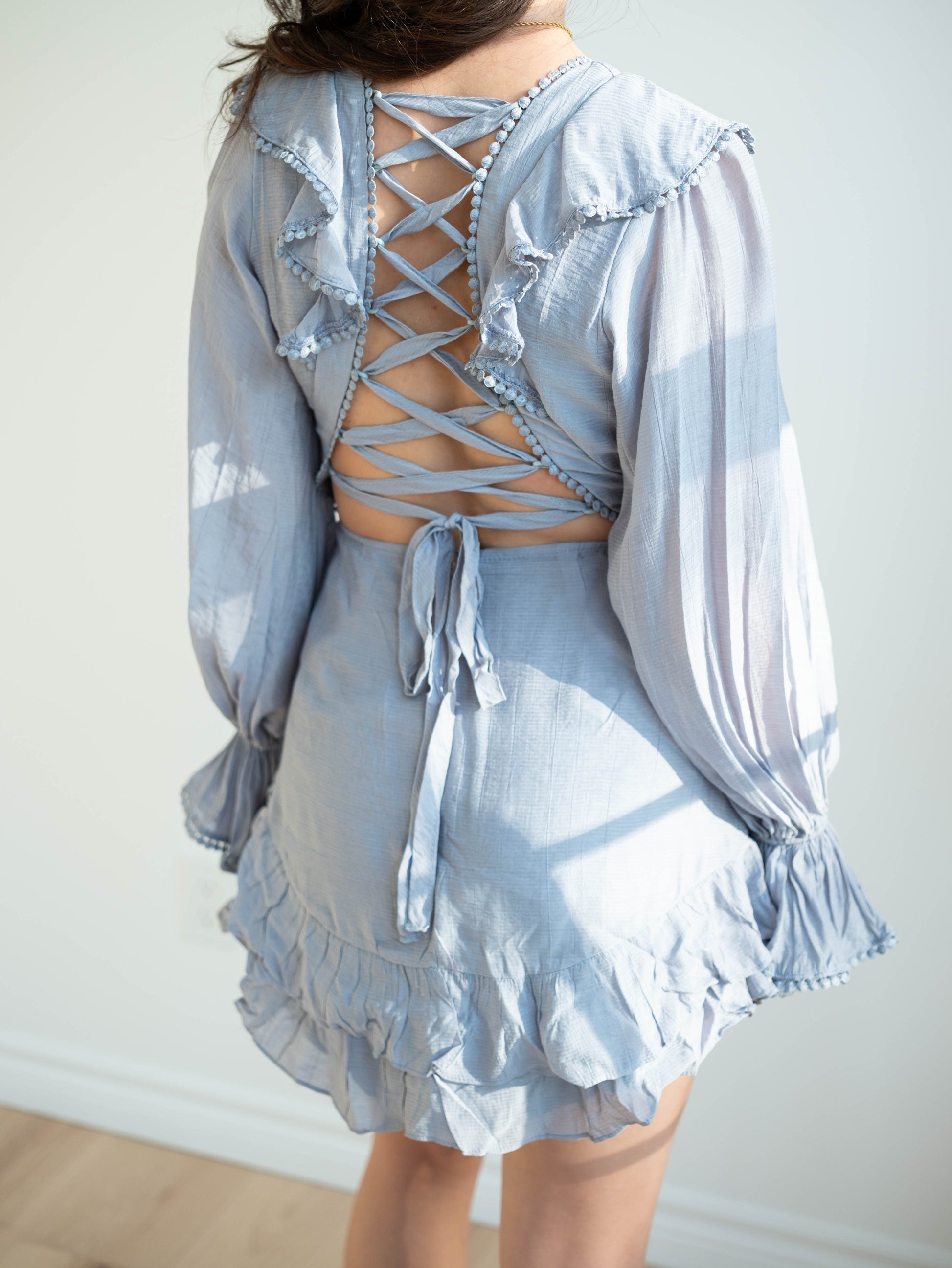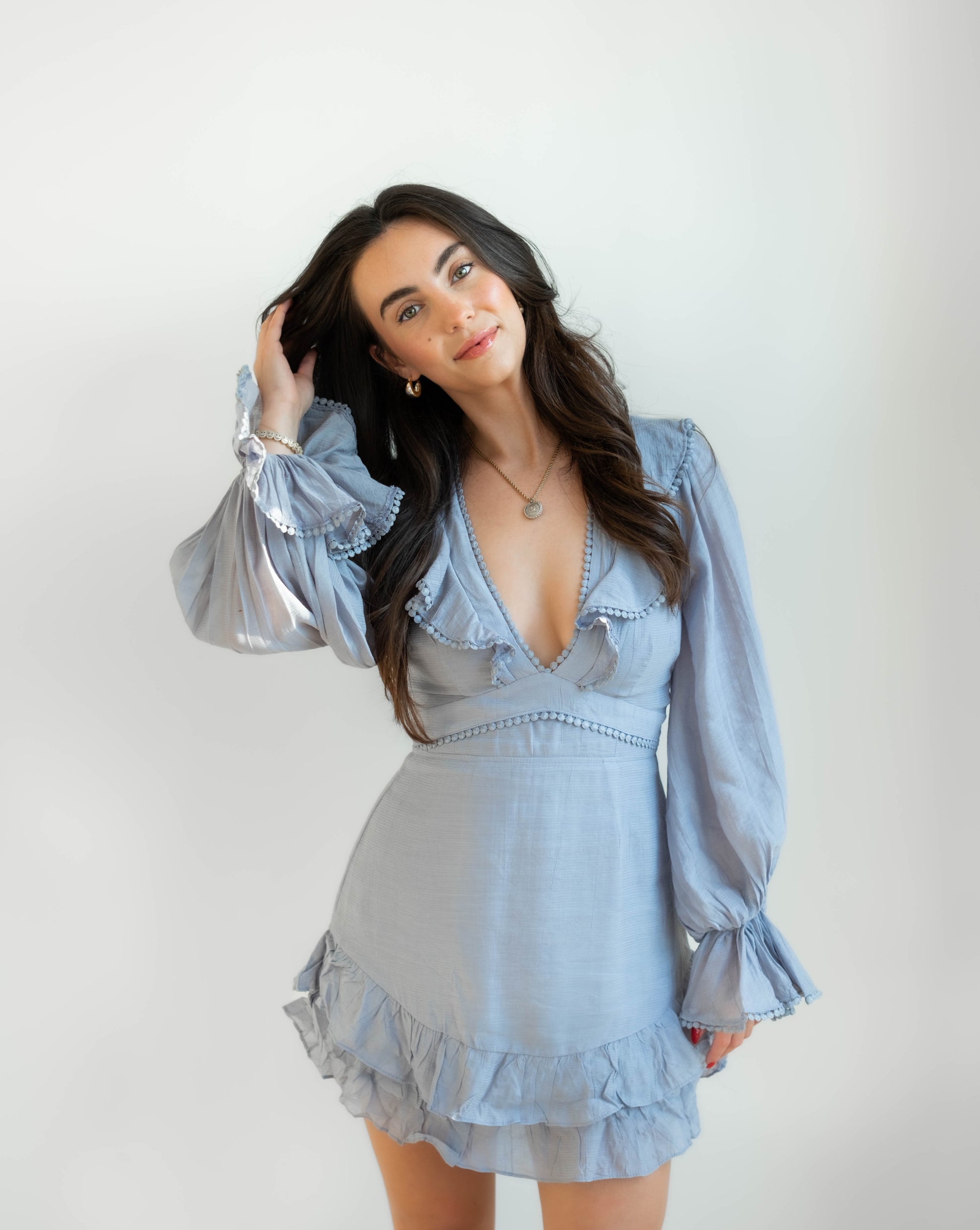 The Emily Ruffle Mini Dress features a V-neckline, long sleeves, and delicate ruffle detailing. It has a lace-up open back and an invisible zipper for a seamless fit. This lightweight mini dress is perfect for any occasion, whether you're dressing up or keeping it casual.