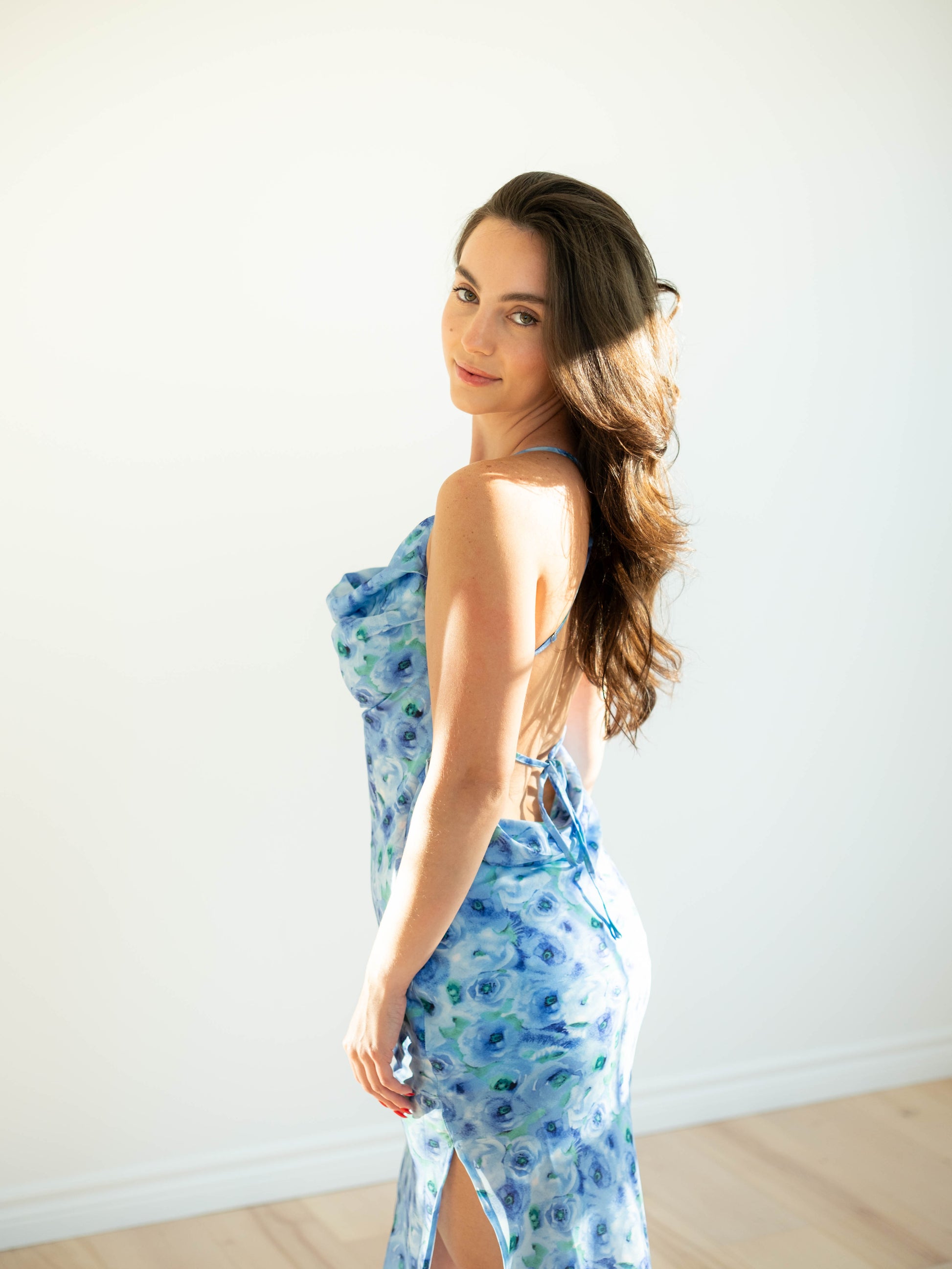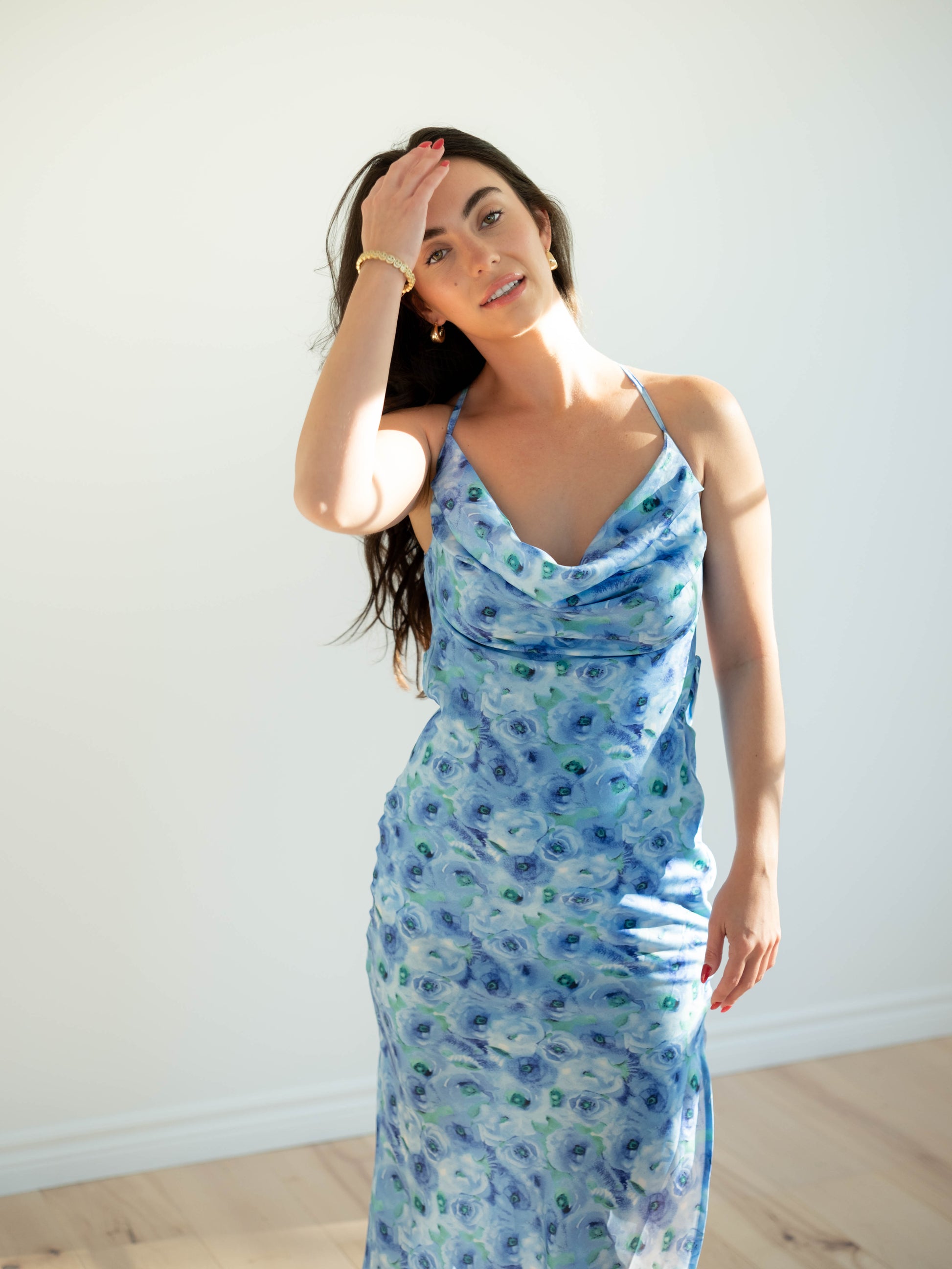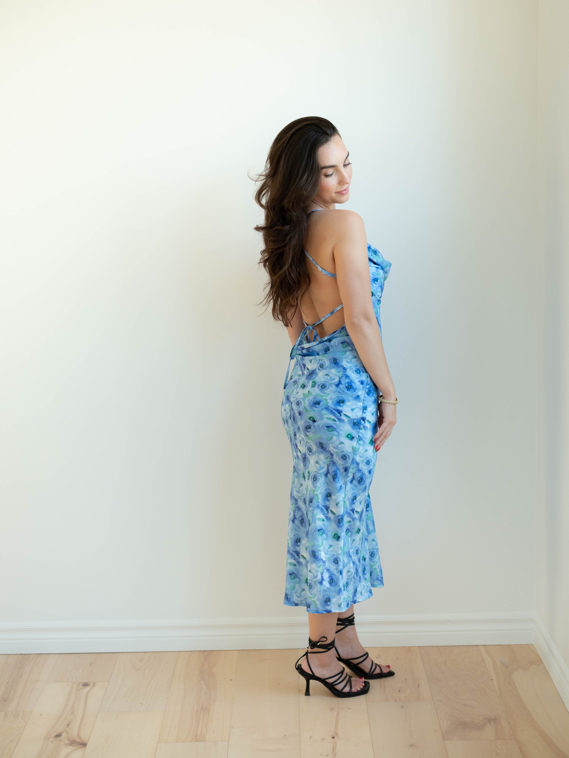 Get ready to turn heads in the Elena Satin Cowl Neck Midi Dress. The delicate floral print adds a touch of whimsy while the cowl neck and open back bring a playful edge. With customizable fit options and a sexy side slit, this midi dress is perfect for any occasion. Don't forget to show off the spaghetti lace-up straps and open back!